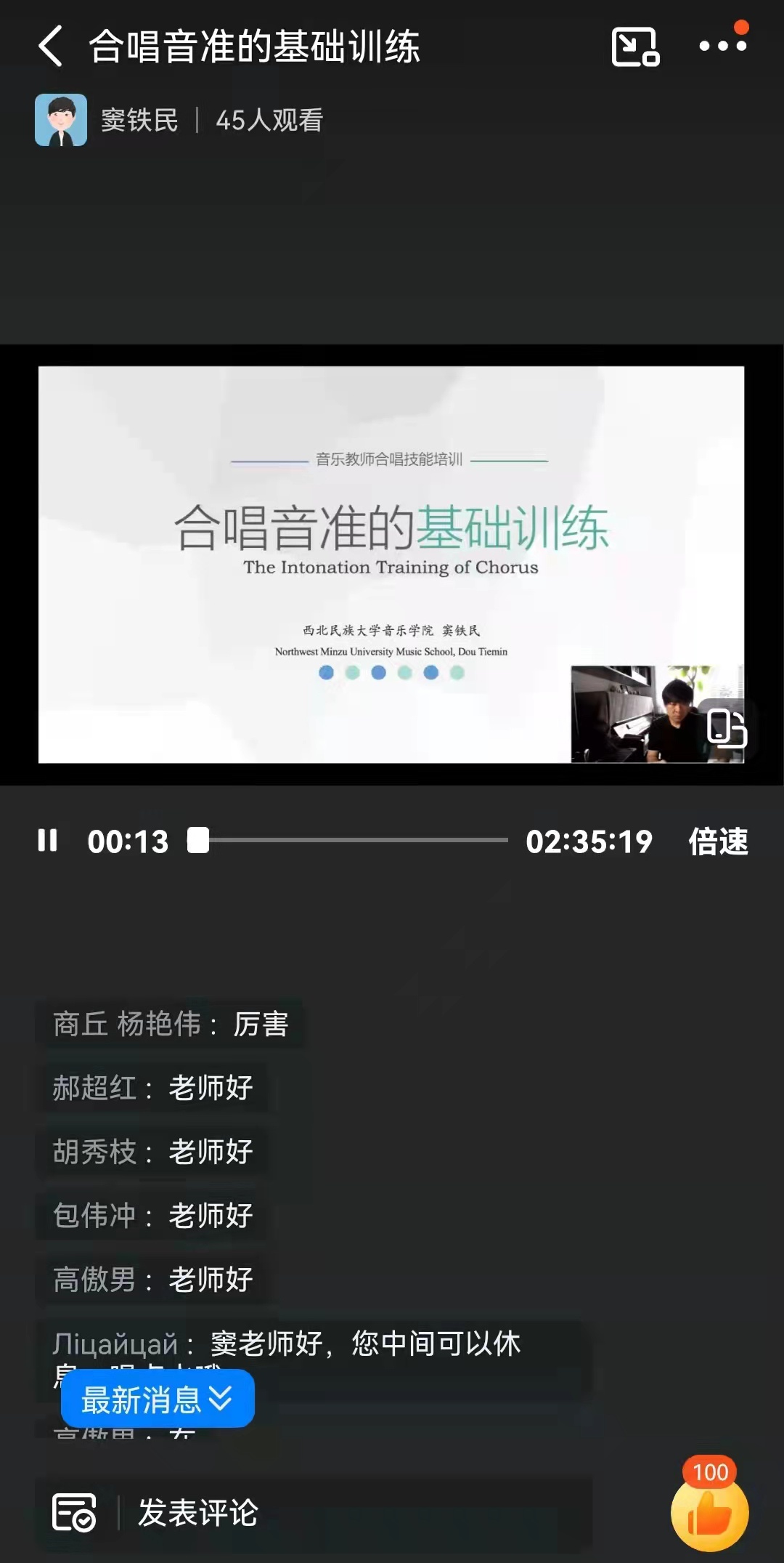 6月3日,应bat365在线中国官网登录入口之邀,西北民族大学音乐学院青年指挥家窦铁民为国培计划——县级骨干教师提升培训小学音乐教师培训班学员讲授《合唱音准的基础性训练》。由于疫情防控,本次采用线上授课。