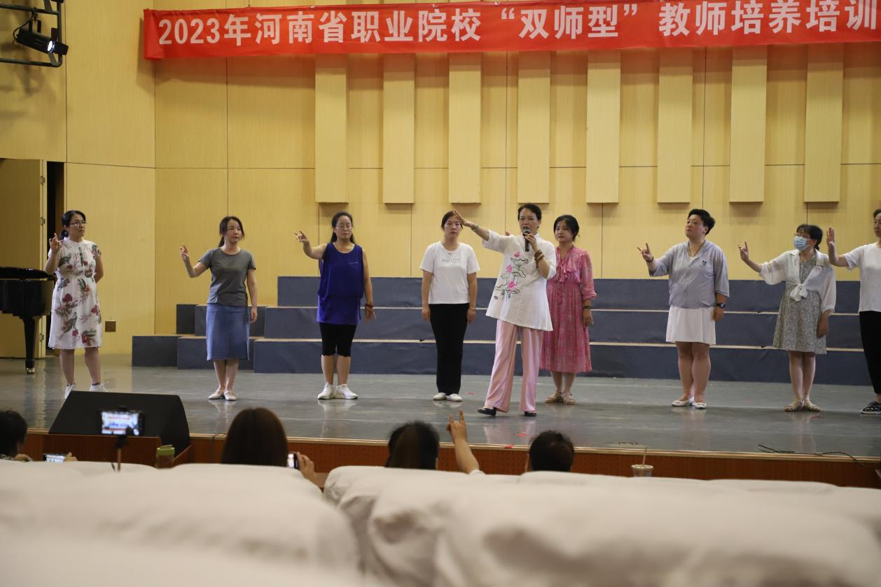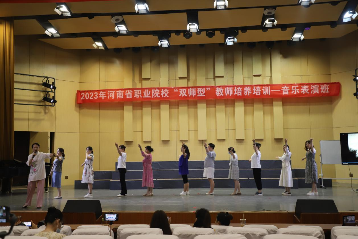 下午,郭德华教师带领“双师”学员们进行戏曲表演实践,分别展示了男女角色在戏曲中的不同动作、身段、步调;并详细讲解了豫剧《谁说女子不如男》中的唱腔与动作,带领学员们完成了这一选段的学习;最后,郭老师鼓励学员们积极进行戏曲展示,鼓励学员们表演自己在平时所学习的戏曲选段。