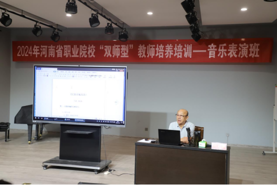 2024年7月14日上午,应bat365之邀,国家一级作曲家刘宏奎老师为2024河南省“双师型”教师培养培训音乐表演班学员讲授《大别山民歌改编》这一专题,并分享了自我的研究成果与学员们进行积极的探讨。