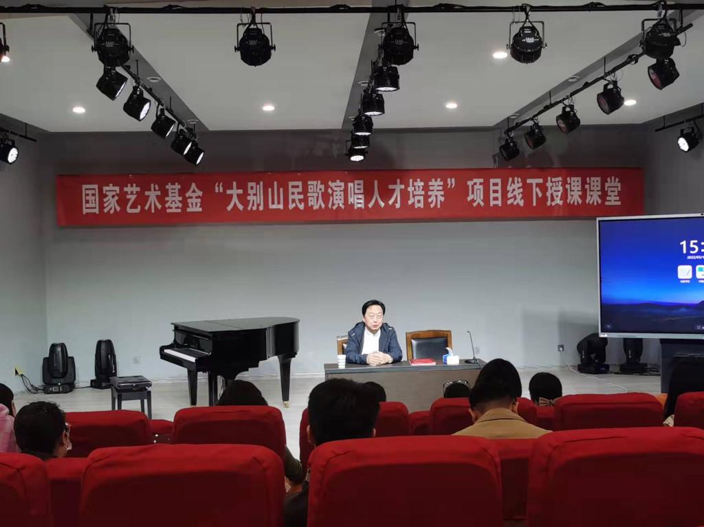 此次讲座中,张居淮教授从自己的艺术生涯说起,讲述了自己和大别山之间的情结之深。接着从三个方面进行了讲授,一是民歌的起源与发展,指出了民歌诞生于遥远的古代,形式多样,反映生活的方方面面且具有悠久的发展史。二是民舞的由来,指出了民族民间舞蹈是起源于人民生活中的肢体动作语言,是人们在长期的劳动以及生活中不断创造、积累、发展而形成的。三是民歌与民舞之间的关系,指出了歌与舞是分不开的,虽然属于两个对立的艺术形态,但是他们的共存共生说明了歌与舞是可以相互融合相互映衬的。