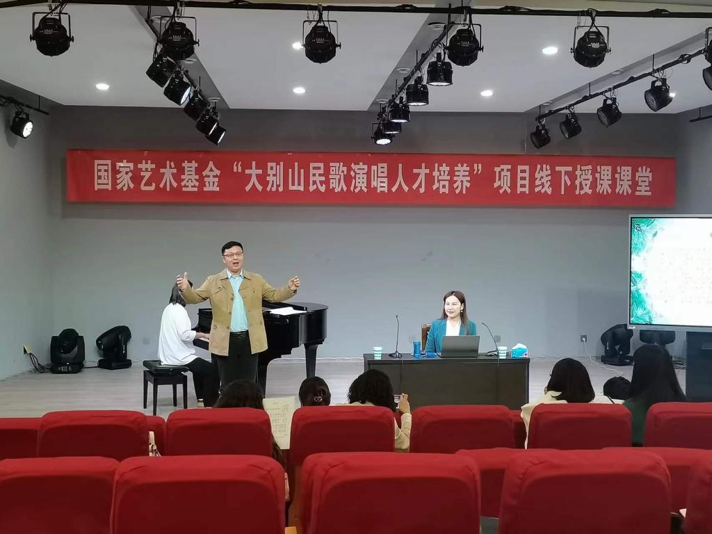 3月14日上午,国家艺术基金“大别山民歌演唱人才培养”线下授课课堂在我校bat365在线中国官网登录入口一楼八音讲堂如期进行。大别山民歌传承人,信阳市民歌研究会副主席李鸣凤应我校邀请,以《豫南田歌》为题进行线下教学。