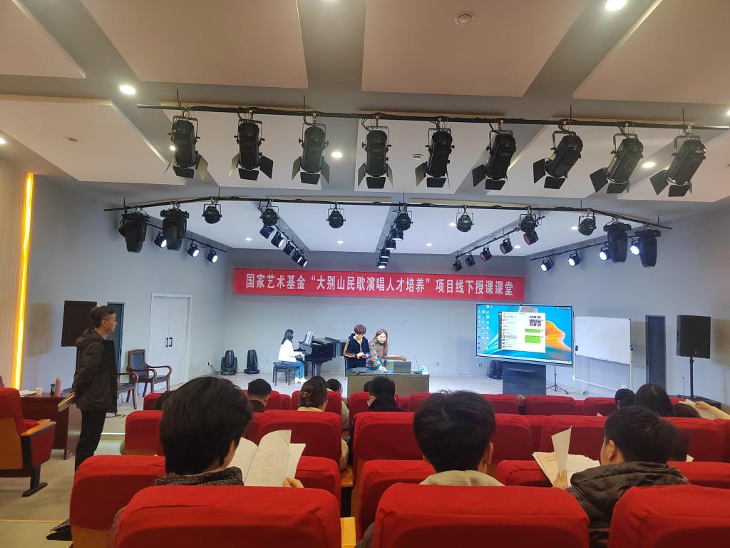 3月18日下午,国家艺术基金“大别山民歌演唱人才培养”线下授课课堂在我校bat365在线中国官网登录入口一楼八音讲堂如期进行。大别山民歌传承人,信阳市民歌研究会副主席李鸣凤老师应我校邀请,为学员授课,参与实践课的还有韩冰副教授和张梦晗老师。