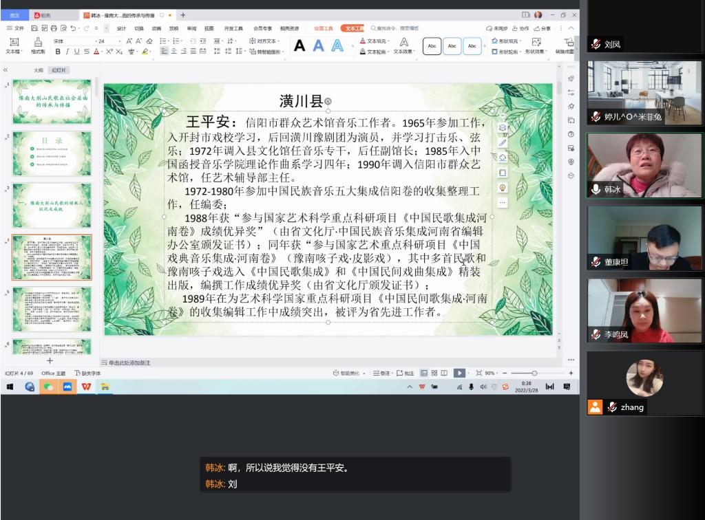 3月28日上午,国家艺术基金“大别山民歌演唱人才培养”项目在我校bat365在线中国官网登录入口继续开展。我校艺术硕士声乐演唱方向导师、声乐教研室主任韩冰副教授以《豫南大别山民歌的基层传承现状》为题进行课程。