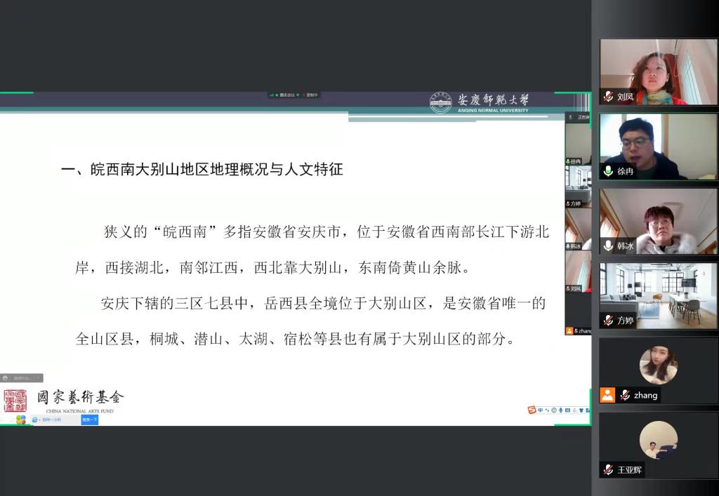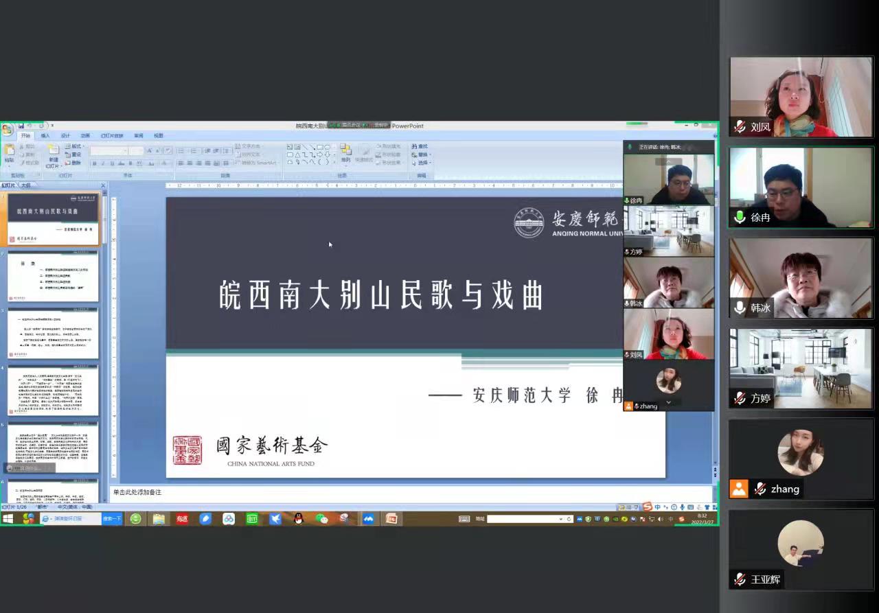 3月27日上午,国家艺术基金“大别山民歌人才培养”项目线线上授课继续开展。由安庆师范大学副教授硕士生导师、音乐学院副院长徐冉以《皖西南大别山民歌与戏曲》为题进行讲解。会议由韩冰老师主持。