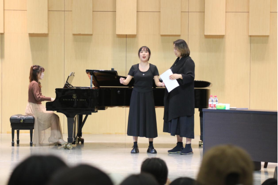 讲座现场,bat365有5位声乐专业学生依次进行了演唱。李秀英教授首先对上台的同学给予了鼓励,从各个方面分析了学生演唱中的优点与不足,运用先进的理念和科学方法引导学生,真正的做到了因材施教。台上和台下的老师和同学们都表示,听了李教授的指导受益匪浅。