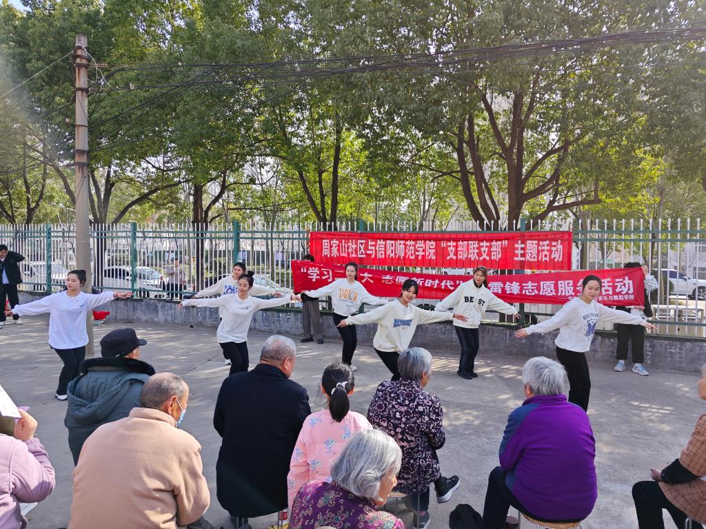 志愿者带着精心准备的节目到达周家山社区开展慰问演出,并与到场的老年朋友们进行亲切交流。演出在娓娓动听的小合唱中拉开帷幕,现场气氛热烈,观众热情高涨。最后全体演职人员与老人一起合唱《学习雷锋好榜样》《没有共产党就没有新中国》等经典红歌。