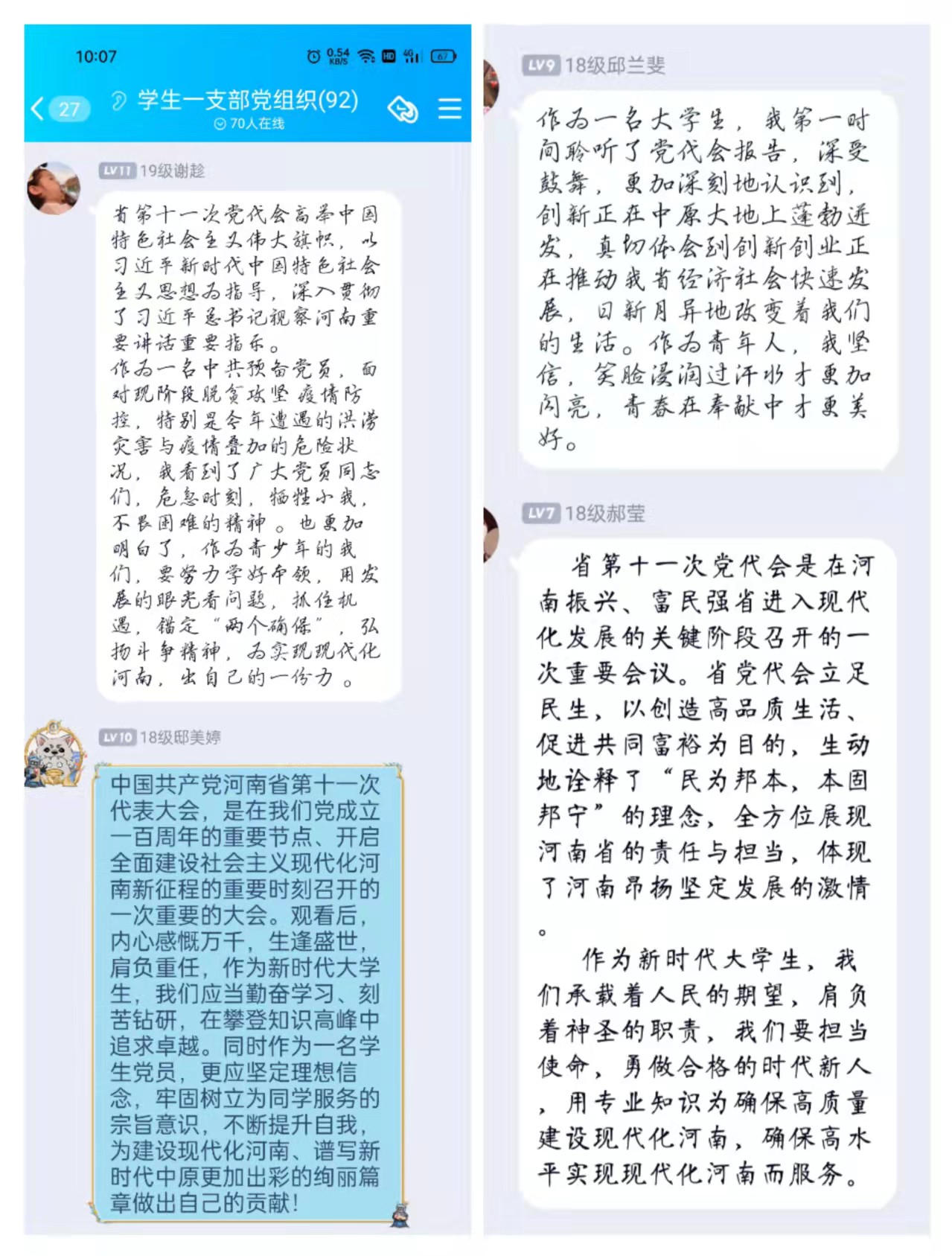 各支部党员在支部书记的带领下认真学习了楼阳生在大会上所做的报告,领悟了会议精神。学生第一党支部支部书记唐晓云在学习会上强调,党代会确立的工作目标、进行的工作部署,通篇体现了对习近平总书记寄予河南“奋勇争先、更加出彩”殷殷嘱托的回应和落实,具有高度的前瞻性、系统性和科学性。党代会报告提出,要把创新摆在发展的逻辑起点、现代化建设的核心位置。青年大学生是创新的生力军和突击队,要有创新意识、创新勇气和创新能力,要对照新目标、新任务、新要求,发挥敢闯敢试、敢为人先的特色,不断增强开拓创新的能力。楼阳生书记报告中明确提到要“推动文化繁荣兴盛,提升发展软实力”,作为艺术专业的大学生,要主动担当作为,坚定文化自信,学好基本功,提高专业素养,潜心创作优秀的文艺作品。