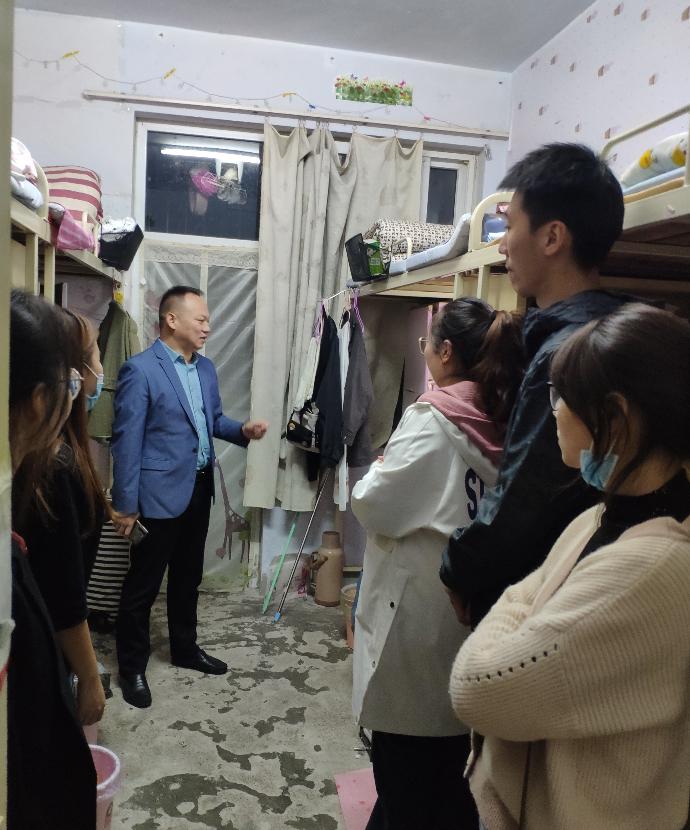 郭振与同学们亲切交谈,并就学生家庭情况、国庆假期离校情况、日常生活学习情况进行了询问了解。他叮嘱学生要做好新学期规划,在疫情防控常态化管理下要遵守学校各项规章制度,做好个人防护,注意安全。郭振同时提醒同学们要保持宿舍的干净卫生,严格遵守学校宿舍管理规定,杜绝使用和存放违禁电器,营造良好的学习生活环境。