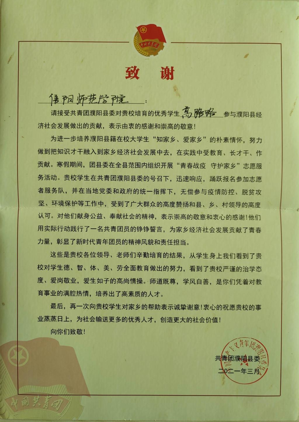 信中提到,高路路同学积极响应共青团濮阳县委的号召,主动请缨,披上志愿者的红袍,踊跃报名、有序参加志愿者服务队。努力做到把知识才干融入到家乡经济社会发展中去,在实践中受教育,长才干,作贡献。高路路同学在当地党委和政府的统一指挥下,无偿参与疫情防控、脱贫攻坚等工作中,受到了广大群众和县、乡、村领导的高度认可。高路路同学用实际行动践行了一名新时代共青团员的铮铮誓言,彰显了新时代大学生德、智、体、美、劳全面发展的风范,展现了青年团员无私奉献、不求回报的高尚节操和一丝不苟、认真负责的工作态度。