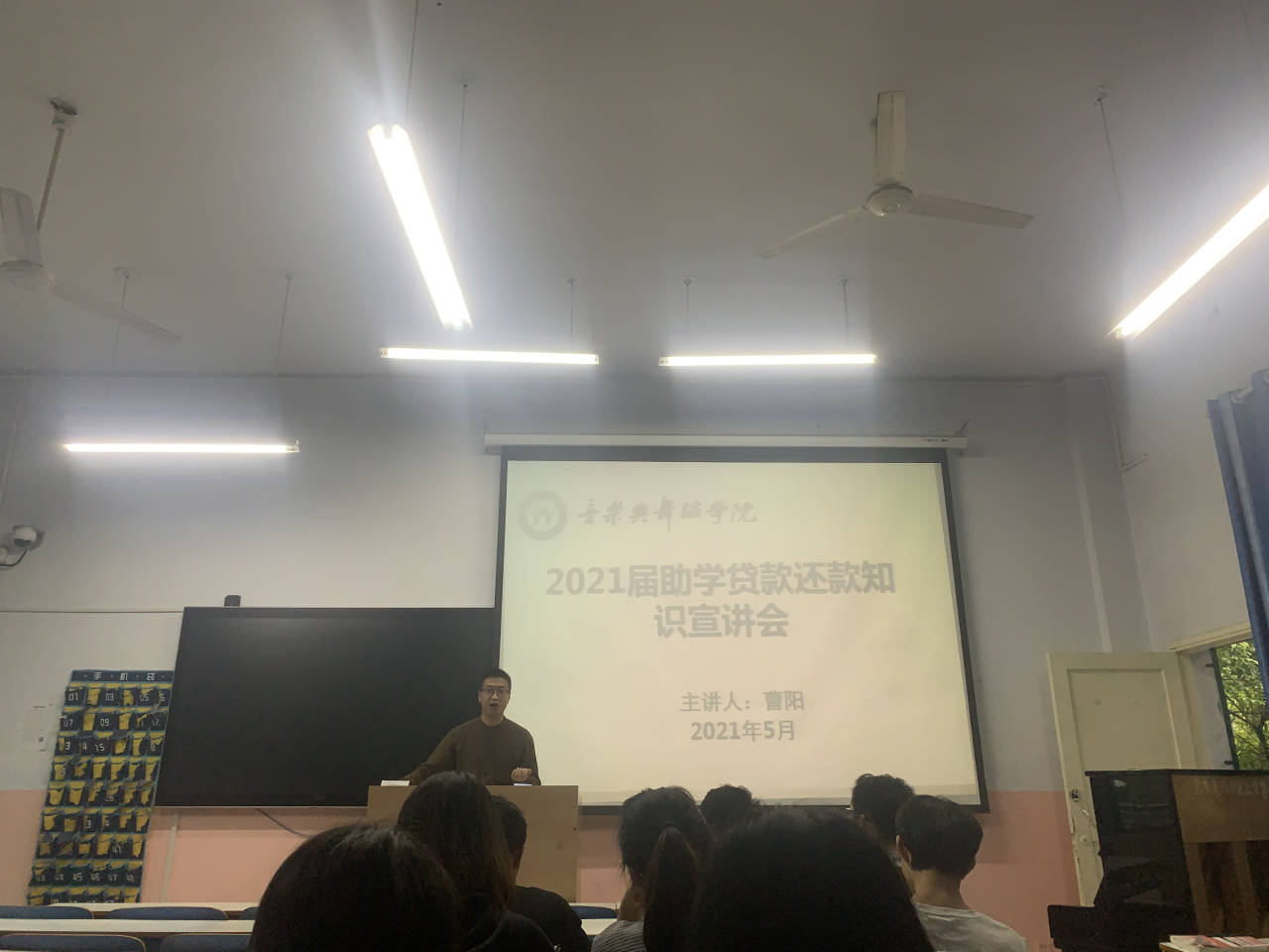 为进一步提高毕业贷款学生的诚信意识、法律意识,增强契约精神,促进国家助学贷款工作的顺利开展,5月13日,bat365在线中国官网登录入口2021届贷款毕业生还款知识宣讲会在教学楼103开展。本次活动由辅导员曹阳老师主讲,2021届贷款毕业生参加了此次会议。