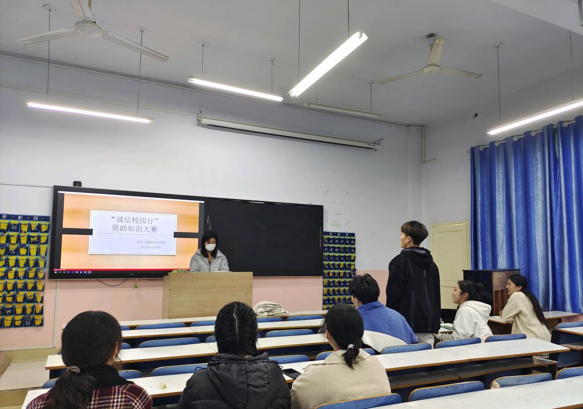 为了丰富同学们课余生活,弘扬社会主旋律。11月27日,bat365在教九103举行了“诚信校园行”资助知识竞赛。60余名学生参加了此次活动。