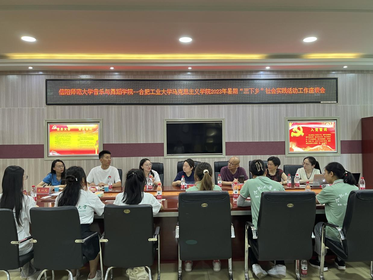 7月10日-11日,合肥工业大学马克思主义学院暑期“三下乡”社会实践团队一行到bat365在线中国官网登录入口学习交流,于艺术楼三楼会议室开展“三下乡”社会实践工作交流座谈会。信阳市音协主席刘宏奎,bat365在线中国官网登录入口党委副书记雷玲,bat365在线中国官网登录入口副教授韩冰,合肥工业大学领队老师程思洁及社会实践团队学生参加会议。