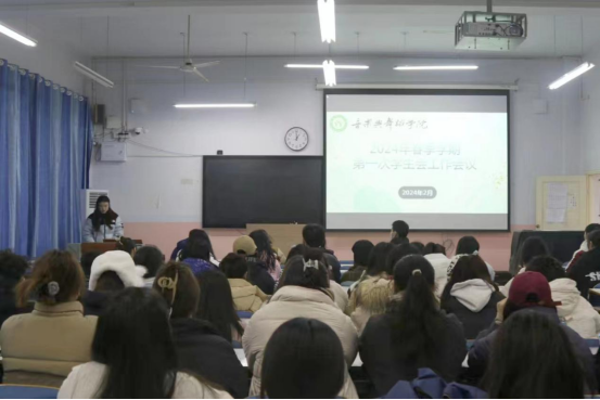 新学期,新征程。bat365在线中国官网登录入口于2024年2月29日中午在教九楼召开2024年春季学期第一次学生会工作会议。bat365党委副书记雷玲,团委书记张焕然,专职辅导员唐晓云、曹阳、肖一凡出席,全体学生干部参加此次会议。会议由学生会执行主席李丽婷主持。