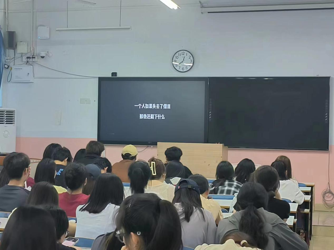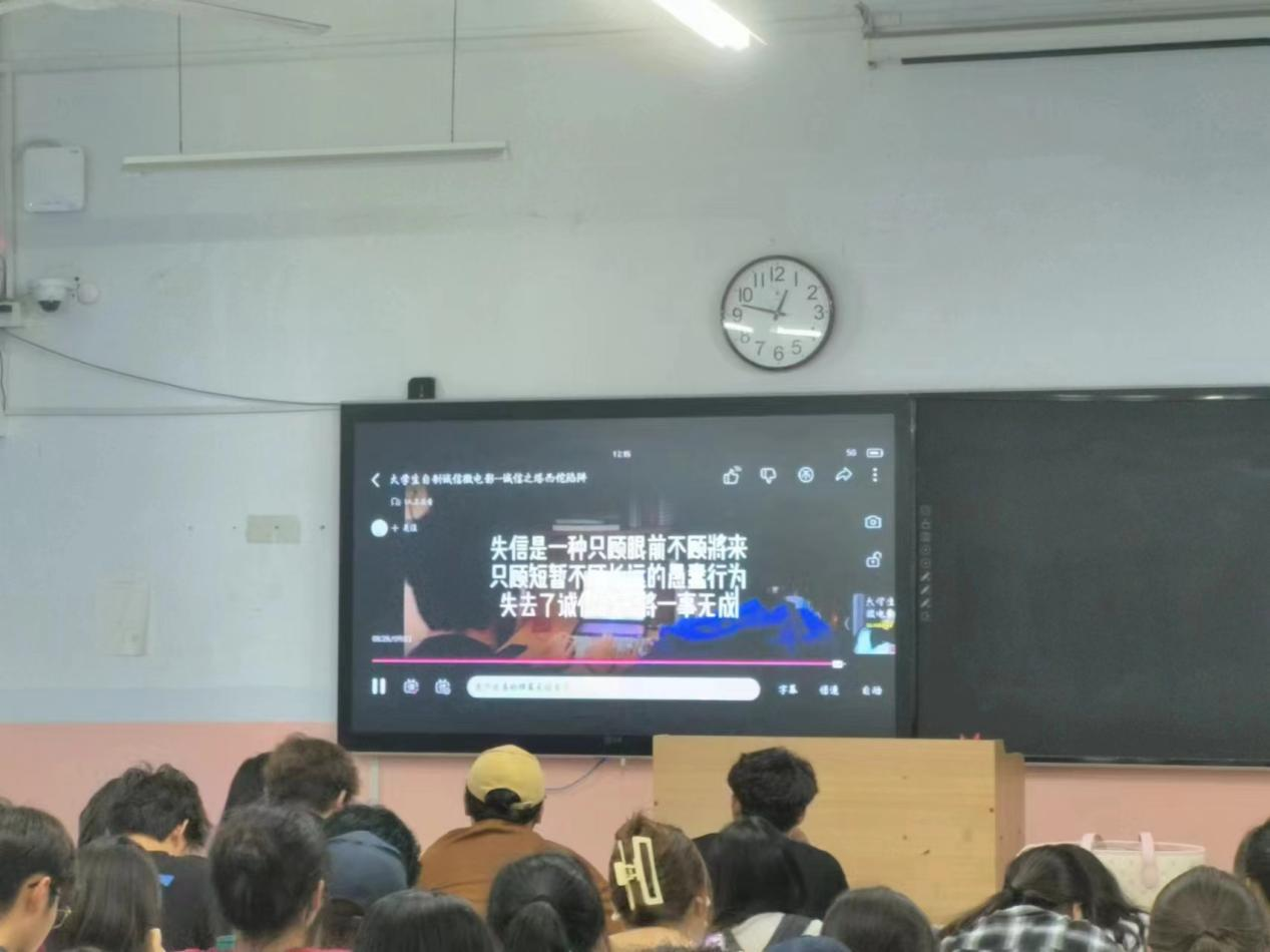 活动伊始,由负责人组织同学们有序落座。活动形式以观看诚信教育的宣传片进行。宣传片以诚信贷款为主要内容,引导同学们珍爱信用、理性贷款、增强学生征信意识、风险意识以及法律意识,增强同学们的责任感,帮助他们树立正确的消费观、价值观,引导学生们理性消费、珍视诚信,远离不良“校园贷”。最后由活动负责人对本次活动进行总结,组织同学们有序离场。