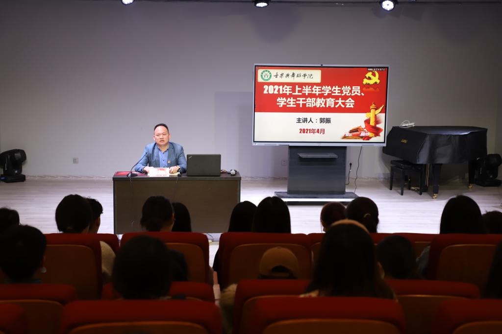 为充分发挥学生党员和学生干部的模范带头作用,4月9日下午,学院在艺术楼八音讲堂召开2021年上半年学生党员、学生干部教育大会。各个学生党支部书记、各年级专职辅导员与百余名学生党员、学生干部共同参加了大会,会议由党委副书记郭振主讲。