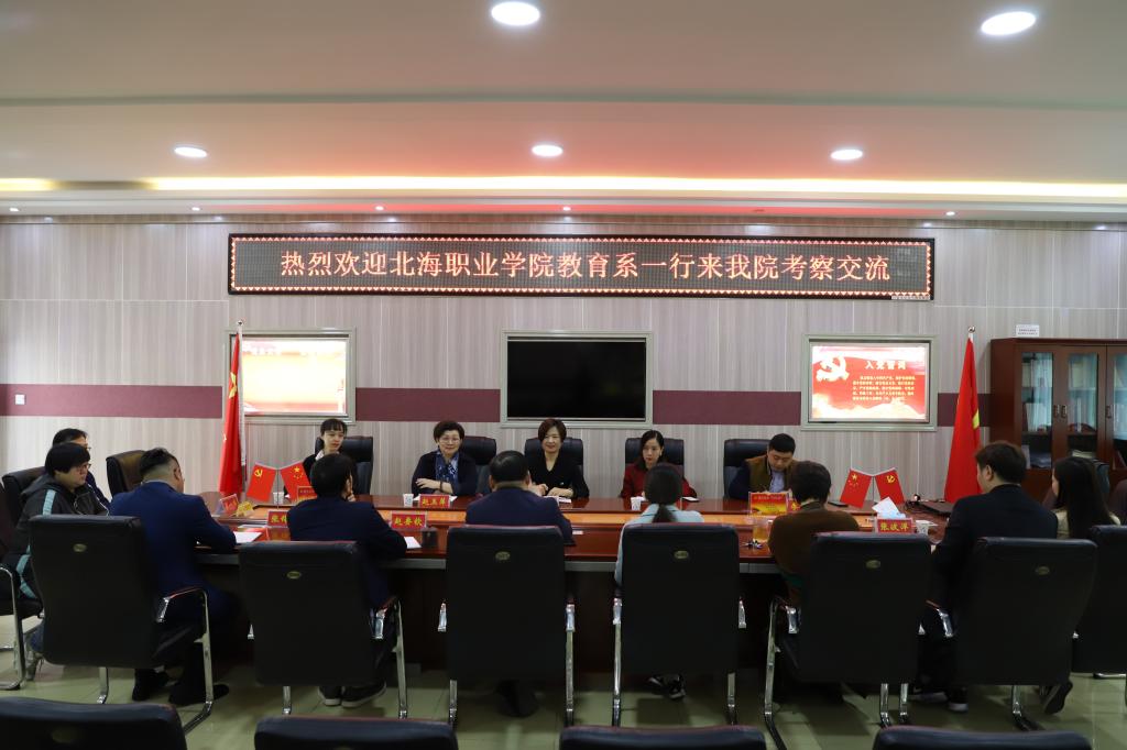 4月27日上午,北海职业学院教育系在系主任林锐的带领下一行5人到bat365前来考察交流。bat365副院长任远、艺术实践中心主任赵要钦、办公室主任罗一鸣、团委书记张莹莹、教学秘书张锦锋,教学员牛媛媛、研究生秘书陈楠、合唱团指导教师李彩彩,张波洋与来宾举行了会谈。座谈会由任远主持。