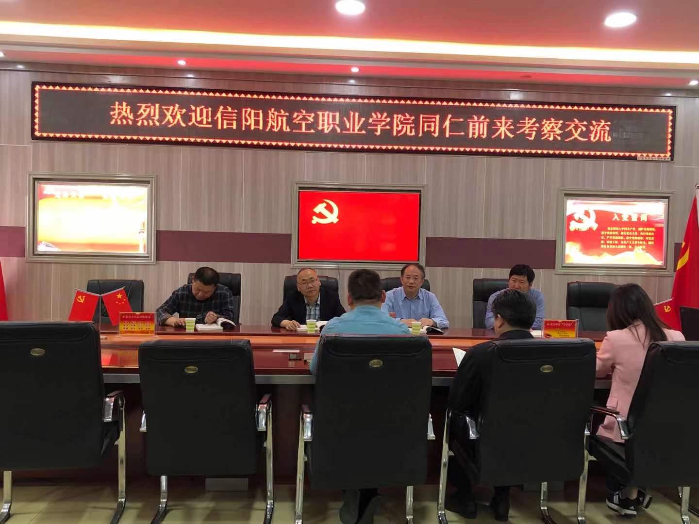 5月8日,信阳航空职业学院党委副书记马聪一行四人前来bat365考察交流党建工作,我校招生就业处处长江玉安同志陪同考察。院党委副书记郭振在艺术楼“党员之家”会议室与来宾进行了座谈交流。