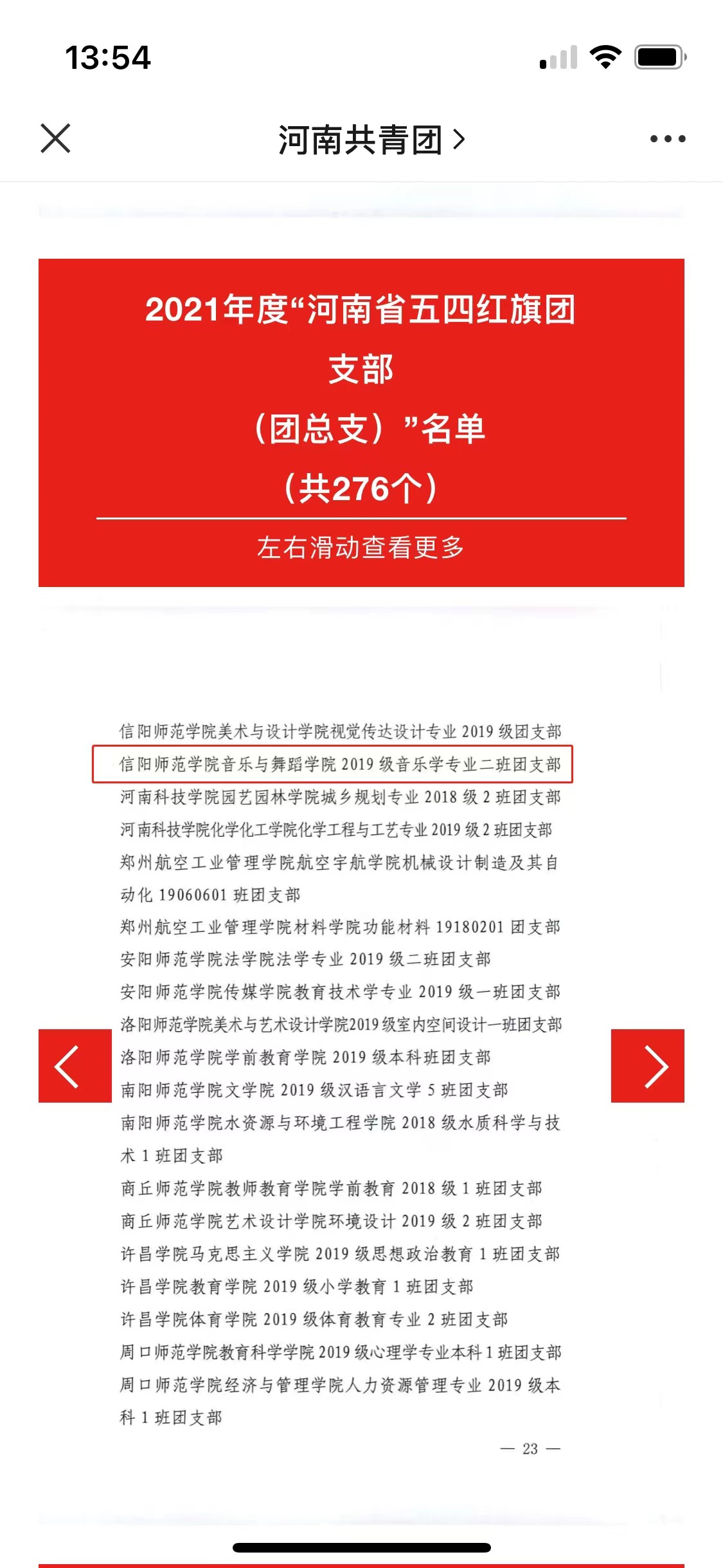 4月29日,共青团河南省委发布《关于表扬2021年度“河南省五四红旗团委(团支部)”“河南省优秀共青团员”“河南省优秀共青团干部”的通知》,信阳师范学院bat365在线中国官网登录入口2019级音乐学专业二班被共青团河南省委授予“河南省五四红旗团委”荣誉称号。