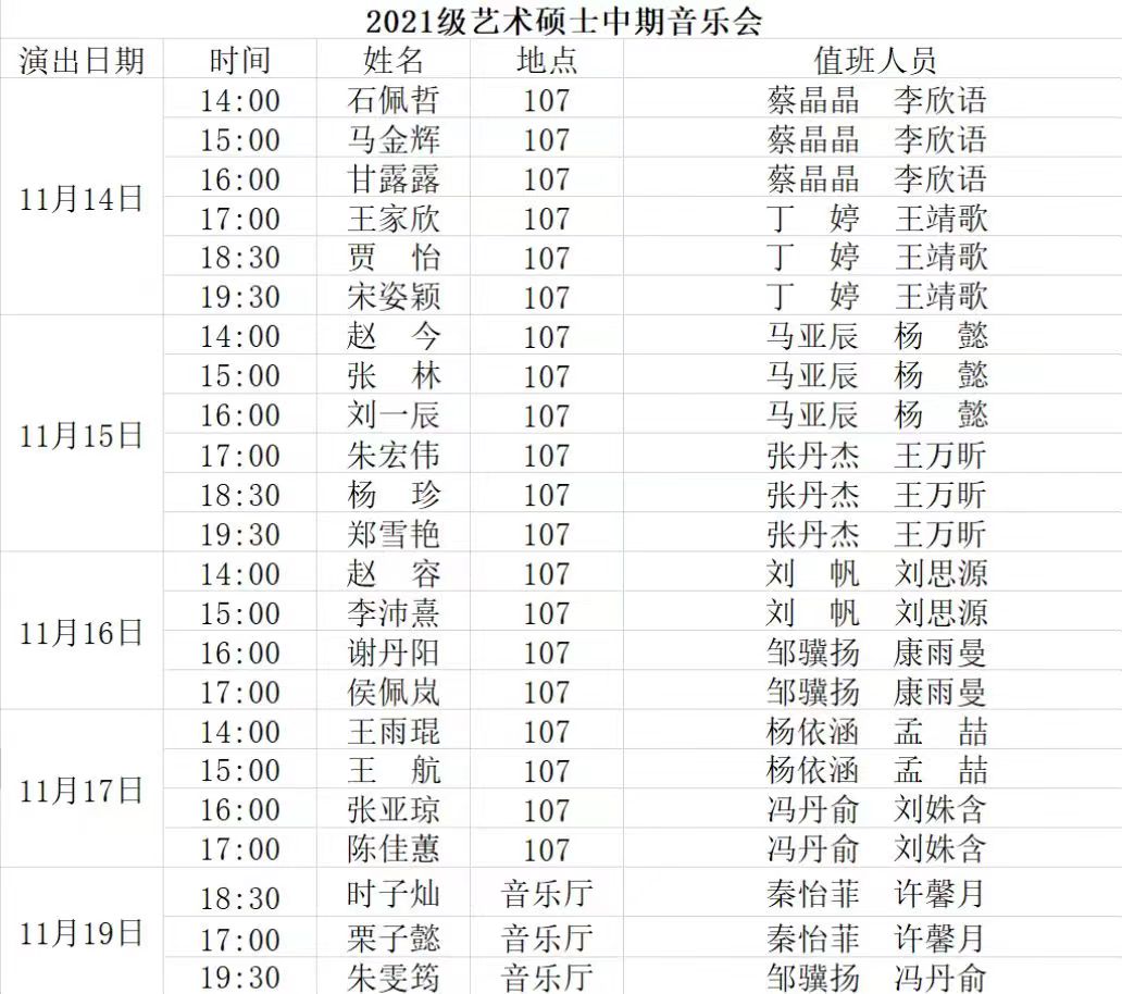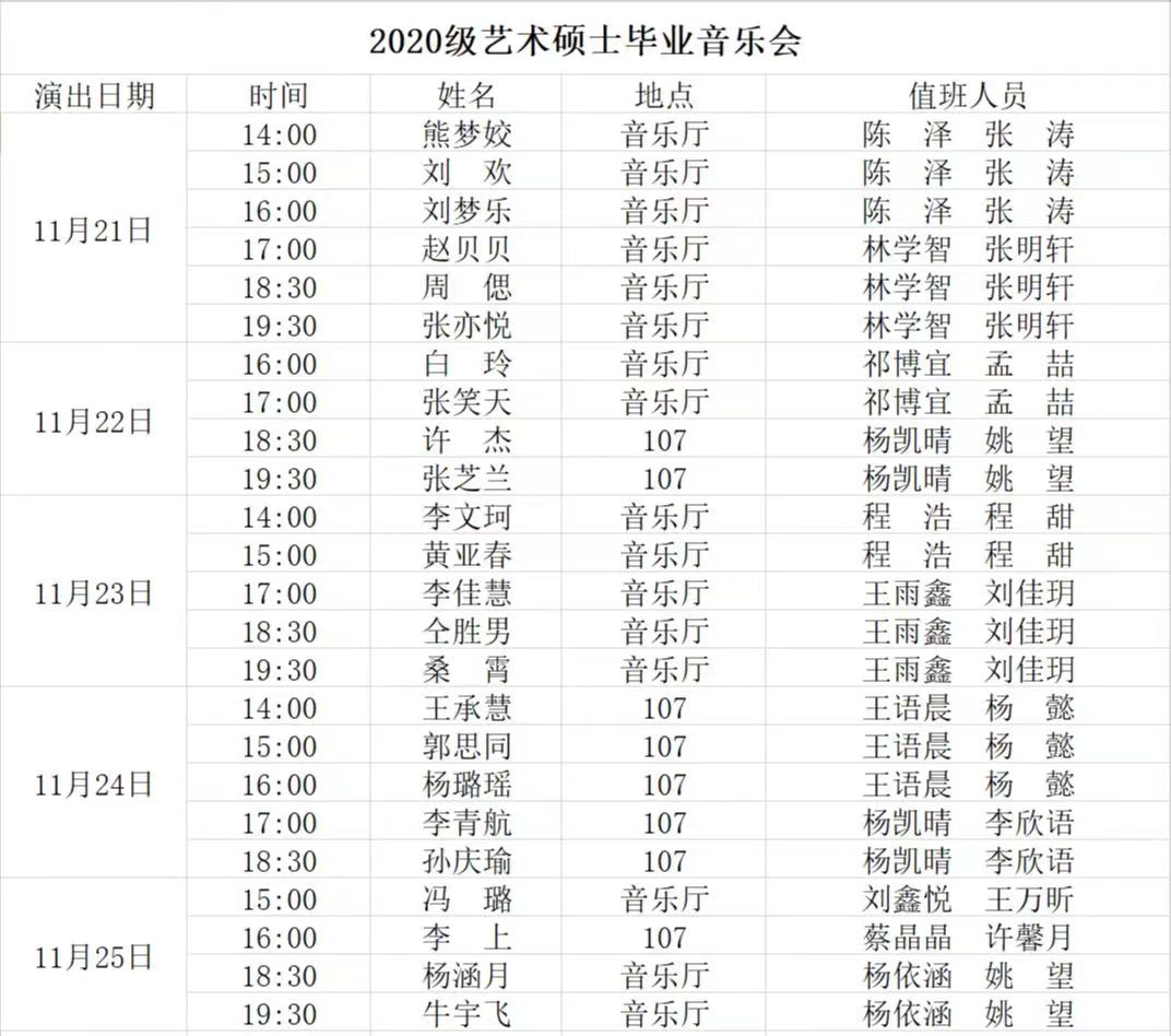 2022年11月14日起,bat365在线中国官网登录入口将在音乐厅和八音讲堂陆续开展2020级艺术硕士毕业音乐会和2021级艺术硕士中期音乐会。