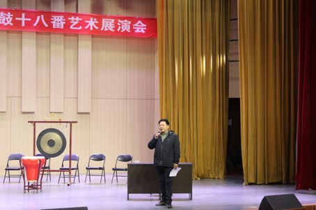 研讨会结束后激动人心的展演会拉开序幕,台下座无虚席。展演会由于立刚老师主持,长达六分钟的演奏让我们深切感受到锣鼓十八番的魅力。旋律时而轻盈跳跃,时而强劲有力,展示出威武雄壮的声势。一曲结束,司鼓手魏老师对课题组的提问进行了解答,让我们对潢川锣鼓十八番有了更深一层次的理解。随后,乐队再次进行了更入佳境的演奏。很快便来到最后环节,同学们积极地上台学习锣鼓艺术,展现出了对传统文化艺术的支持与喜爱。