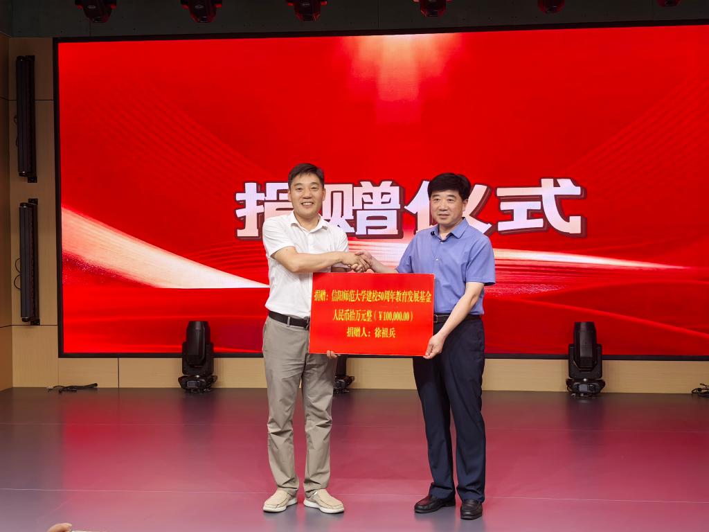 捐赠仪式上,江玉安介绍了学校近年来在学科建设、人才培养和社会服务等方面取得的成就以及50周年校庆的筹备情况,他表示,校友是学校最宝贵的财富,徐祖兵校友的捐赠不仅体现了对母校的深情厚谊,更展现了信阳师大人饮水思源、回馈母校的优良传统。50周年校庆在即,诚挚邀请海内外校友重返母校,共襄盛举,携手谱写新时代高等教育发展的新篇章。(初审/肖一凡 复审/雷玲 终审/周文勇)