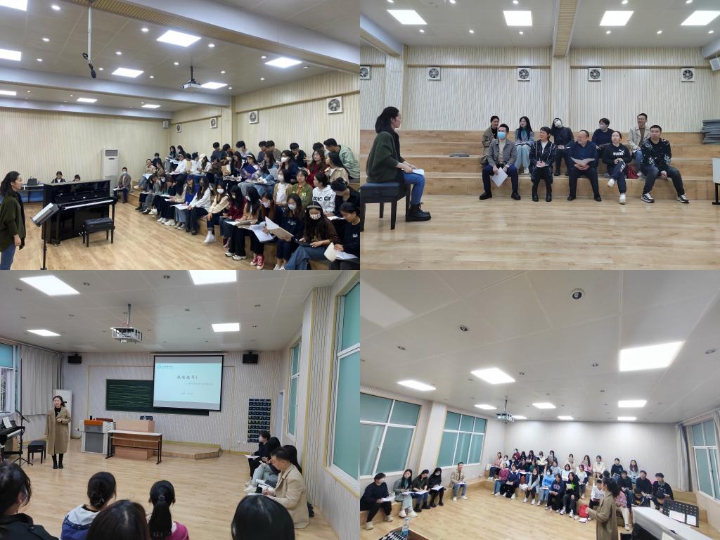 上午第4节,观摩《河南省一流本科线下课程——合唱指挥》,由课程教学团队李彩彩老师授课。李老师带领学生分析了作品的曲式结构,对演唱所需要的不同音色进行了分析,进行了力度等级对比转化训练、咬字训练等,后演绎了无伴奏混声作品《半个月亮爬上来》。